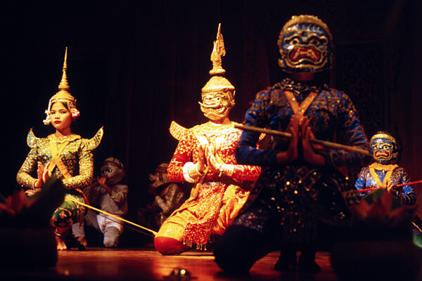 In Cambodia’s villages, plays performed by actors wearing masks are popular. Shadow plays, performed using black leather puppets that enact scenes from the Reamkern, are also enjoyed. Folk dancing is popular in rural Cambodia and is performed spontaneously to a drumbeat.